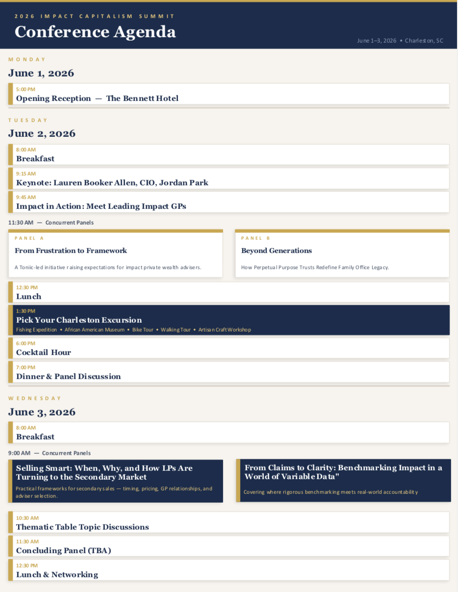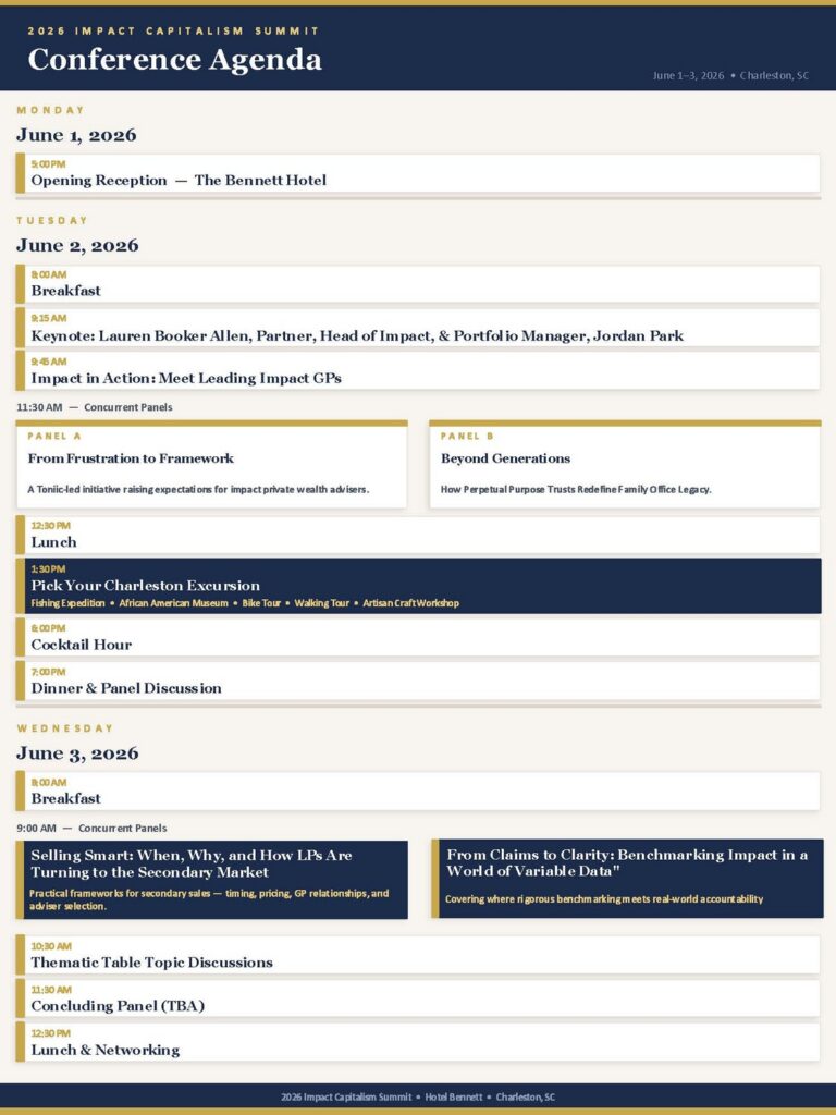 For over a decade, the Impact Capitalism Summit has served as the premier convening for visionary leaders, investors, and decision-makers who are shaping the future of impact investing. As we gather in historic Charleston, the 2026 summit takes on special significance—occurring at a critical inflection point for our industry, just ahead of the midterm elections that will define the policy landscape for years to come.